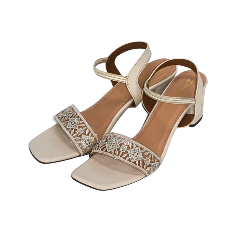 Zelion | Women’s Golden Embroidered Ethnic Block Heel Slip-On Sandal