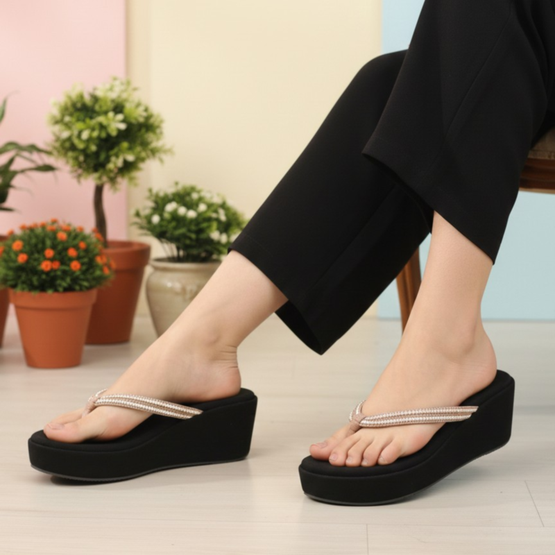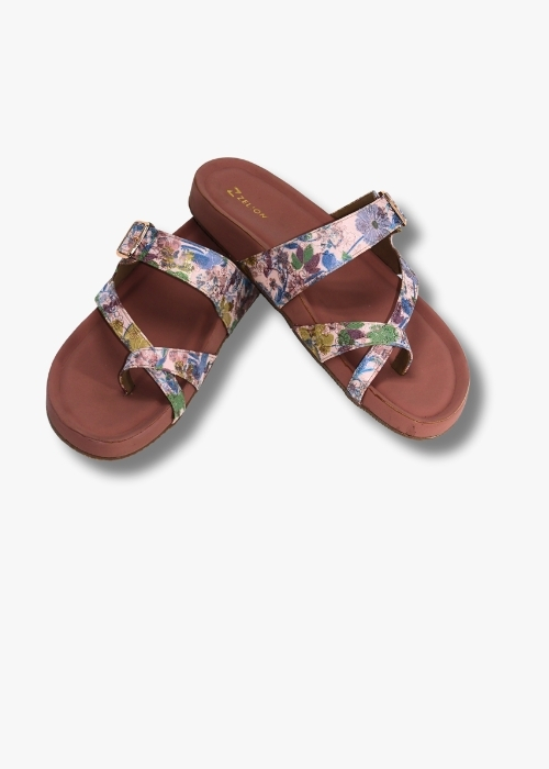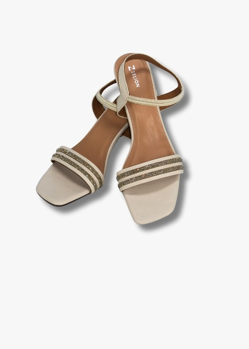 This stylish footwear features a chic multi-strap design with metallic accents, perfect for adding a touch of elegance to any