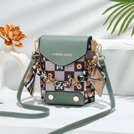 Playful Checkerboard Mini Phone Bag – Scarf & Chain Crossbody