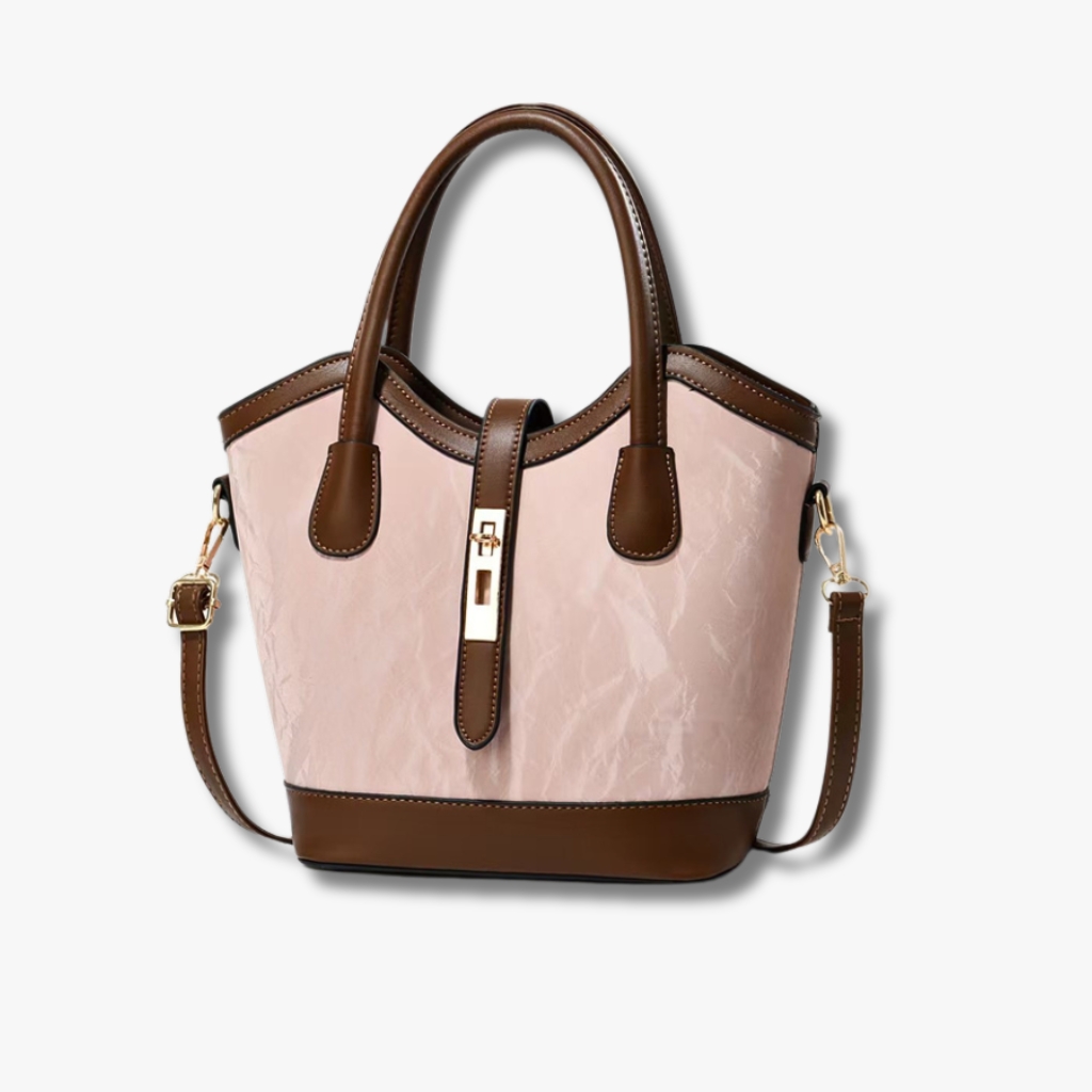 Elevate your everyday style with this chic and versatile bucket tote. This bag stands out with its unique two-tone design, combining a textured, crinkle-effect body with smooth, contrasting trim and handles. The stylish, structured shape and elegant metal hardware make it a sophisticated accessory for any outfit.