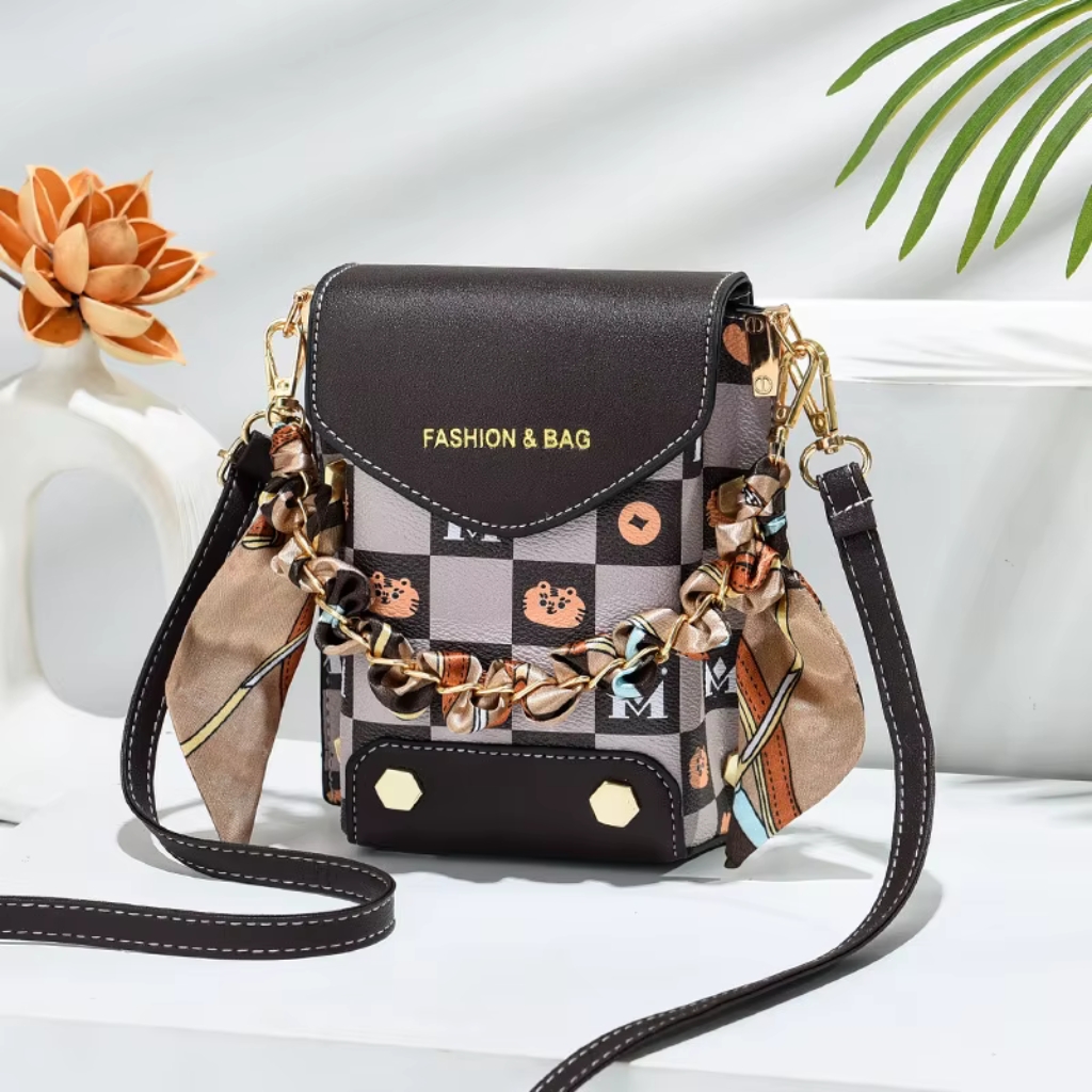 Playful Checkerboard Mini Phone Bag – Scarf & Chain Crossbody