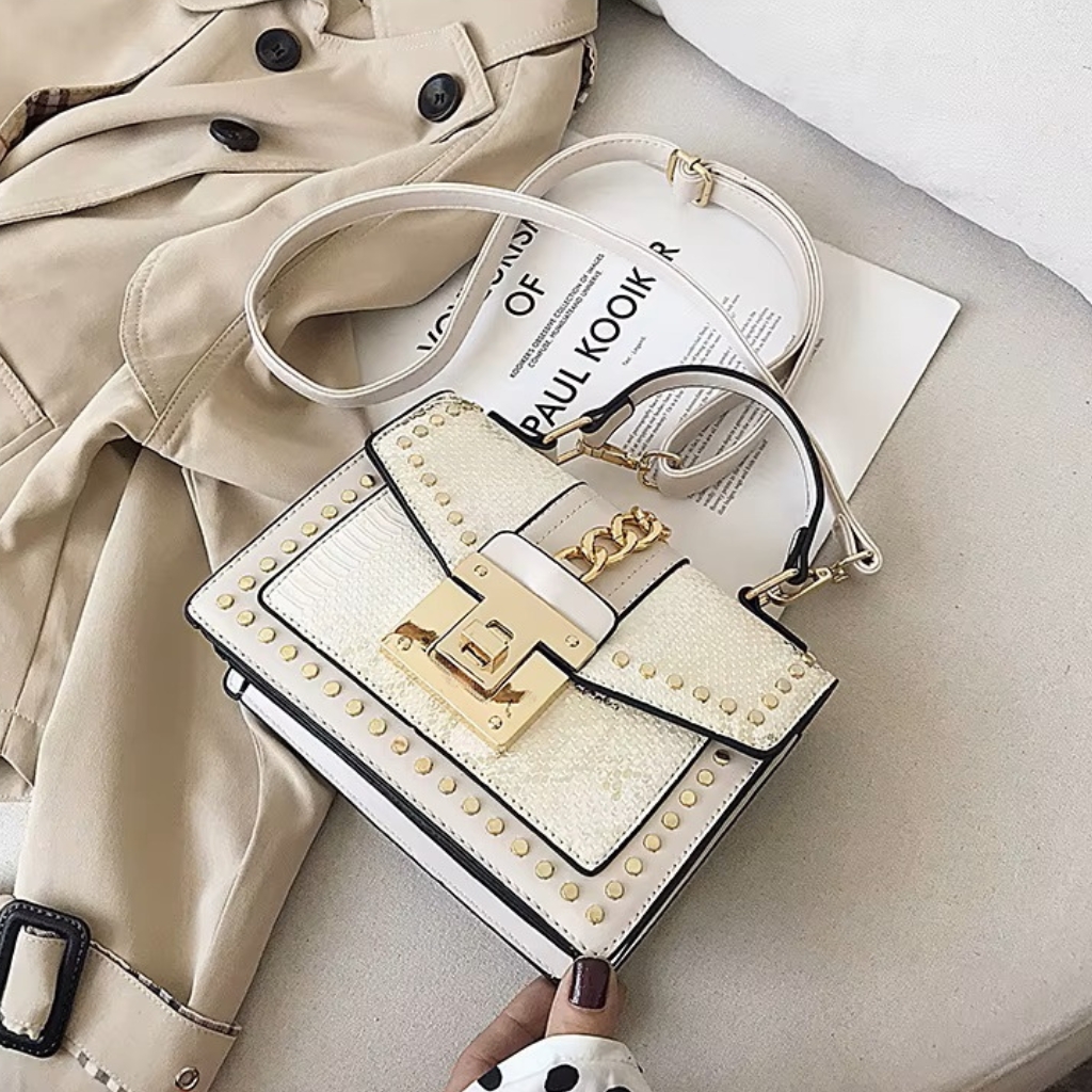 Edgy Glamour: Statement Mini Bag with Gold Hardware Make a fierce fashion statement with this heavily embellished mini bag. Perfect for evenings, parties, or adding an edgy touch to casual wear, this bag combines striking texture with dazzling hardware for a look that commands attention.