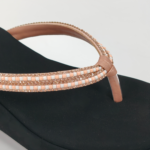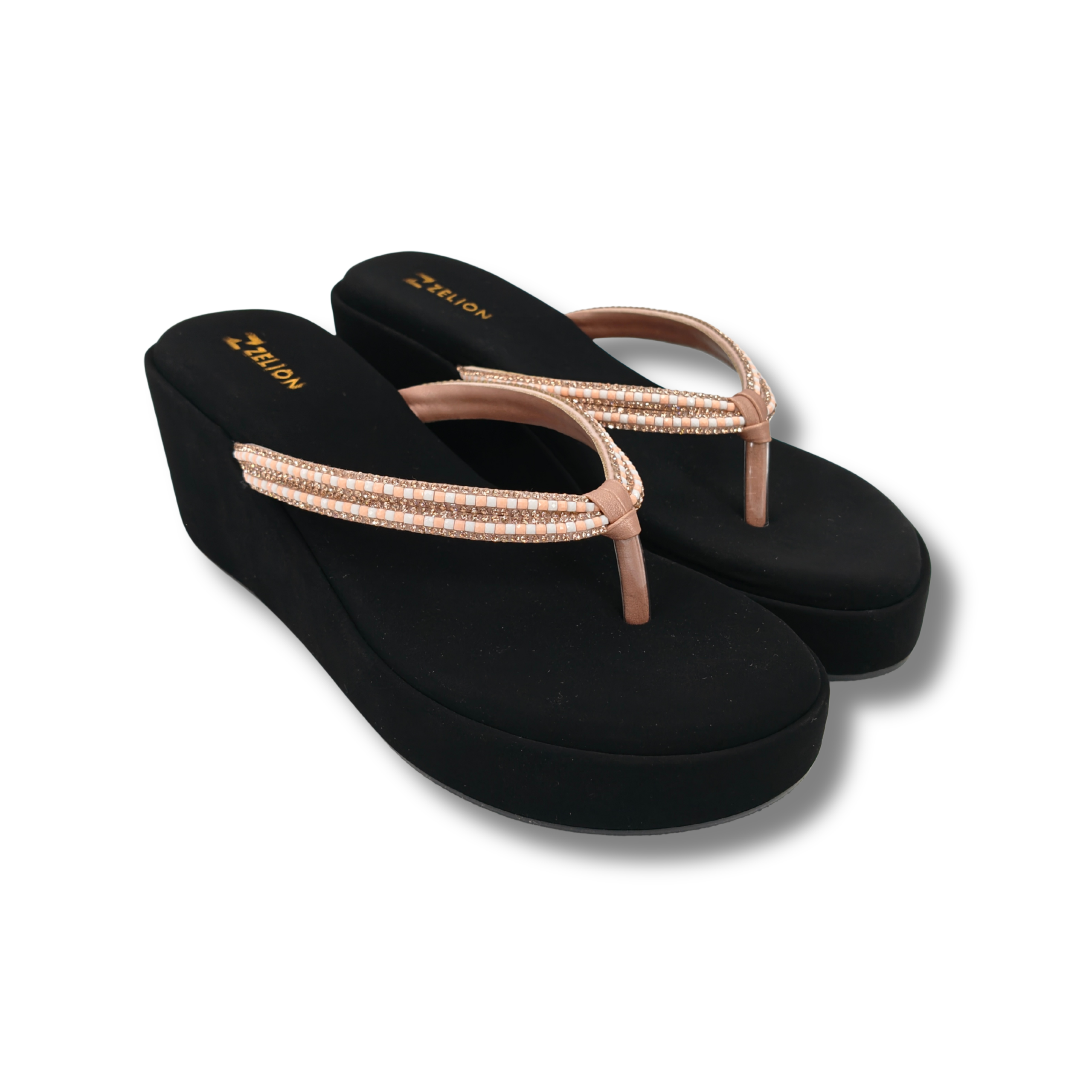 Elevate your everyday style with these stunning platform wedges by Zelion. Designed with a sleek, jet-black velvet-finish sole, these sandals offer the perfect blend of height and comfort. The centerpiece is the glamorous thong strap, intricately adorned with rows of shimmering champagne beads and sparkling crystals. Perfect for transitioning from a day at the beach to a casual evening out, these wedges add a touch of sparkle to any outfit.