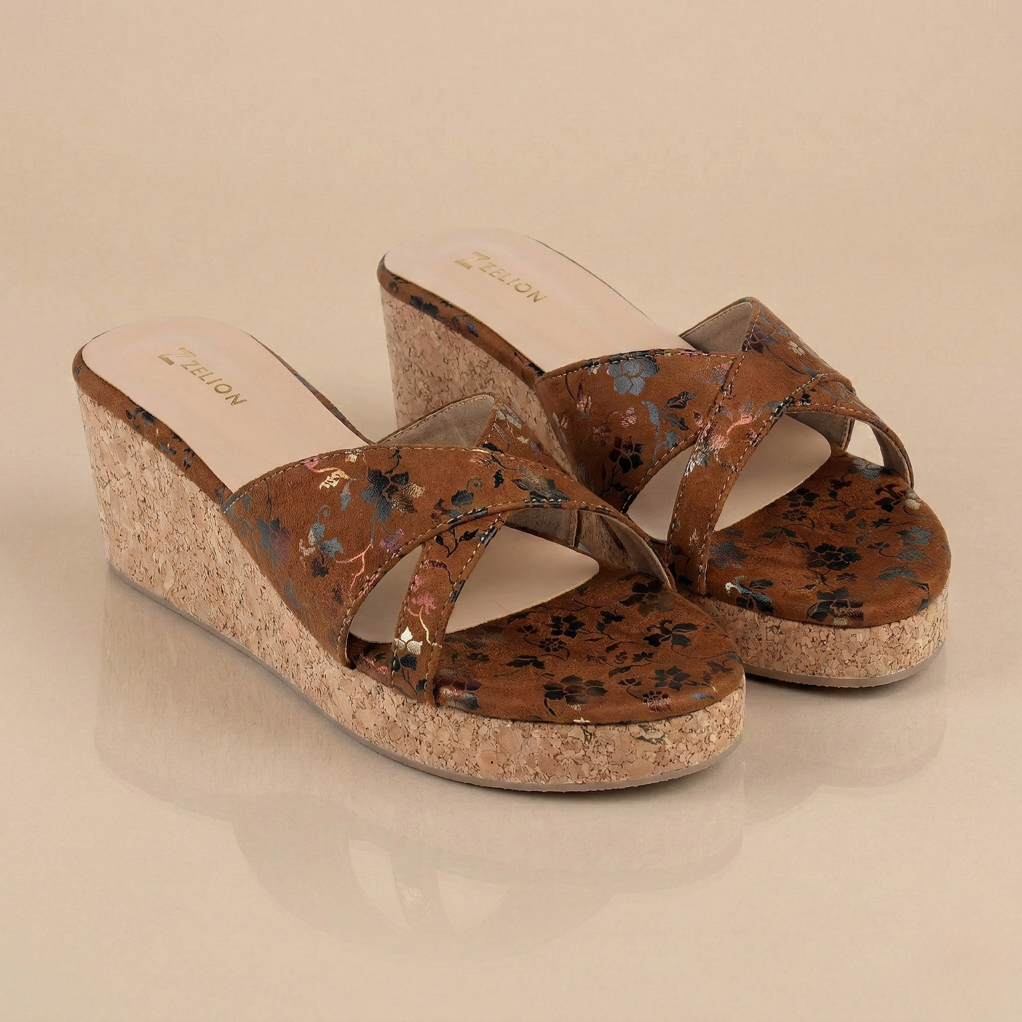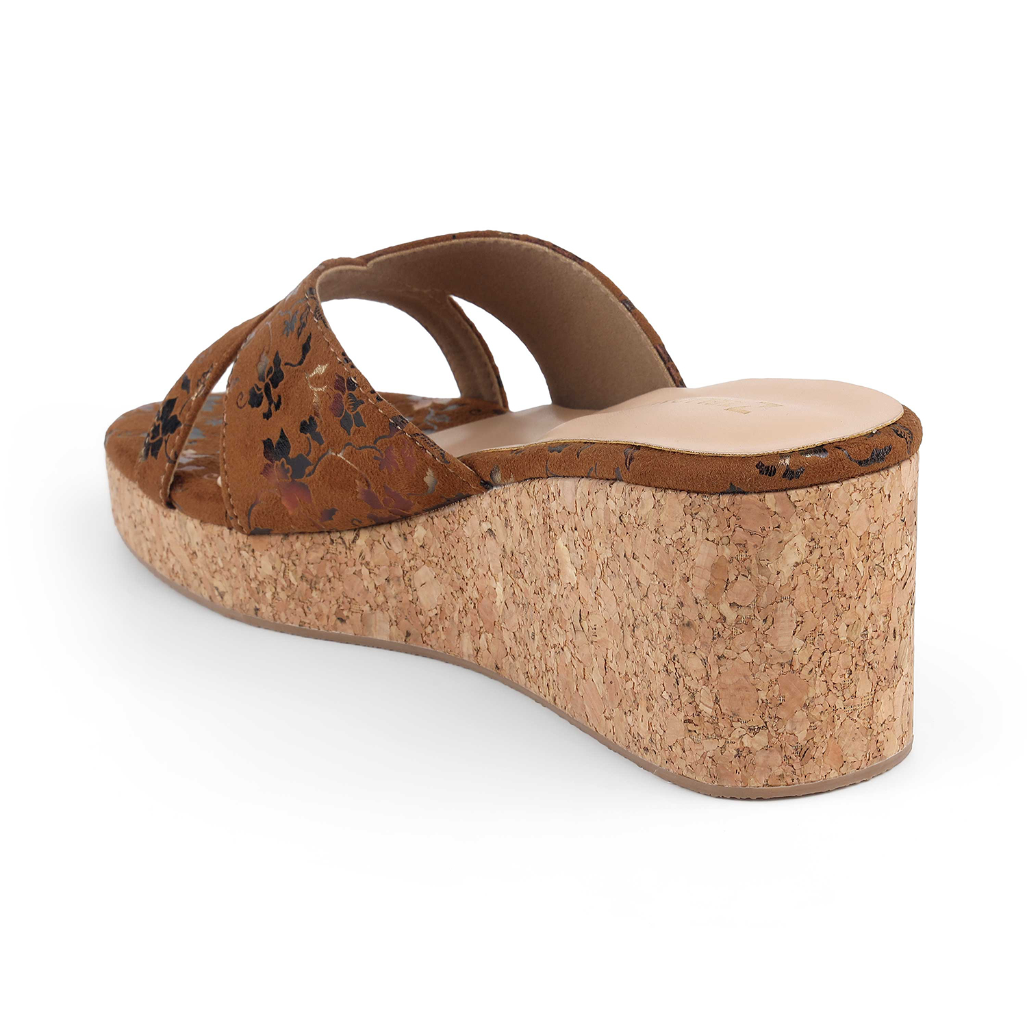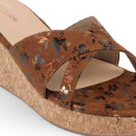 Experience all-day comfort without compromising on style. These wedge sandals feature a supportive cork-look sole that evenly distributes weight, making them perfect for walking. The wide, crisscross straps are crafted from a soft, suede-like material that feels gentle against the skin, while the cushioned footbed ensures a cloud-like feel. Finished with a subtle black and gold floral foil print, these slides add a sophisticated sparkle to your everyday outfits.