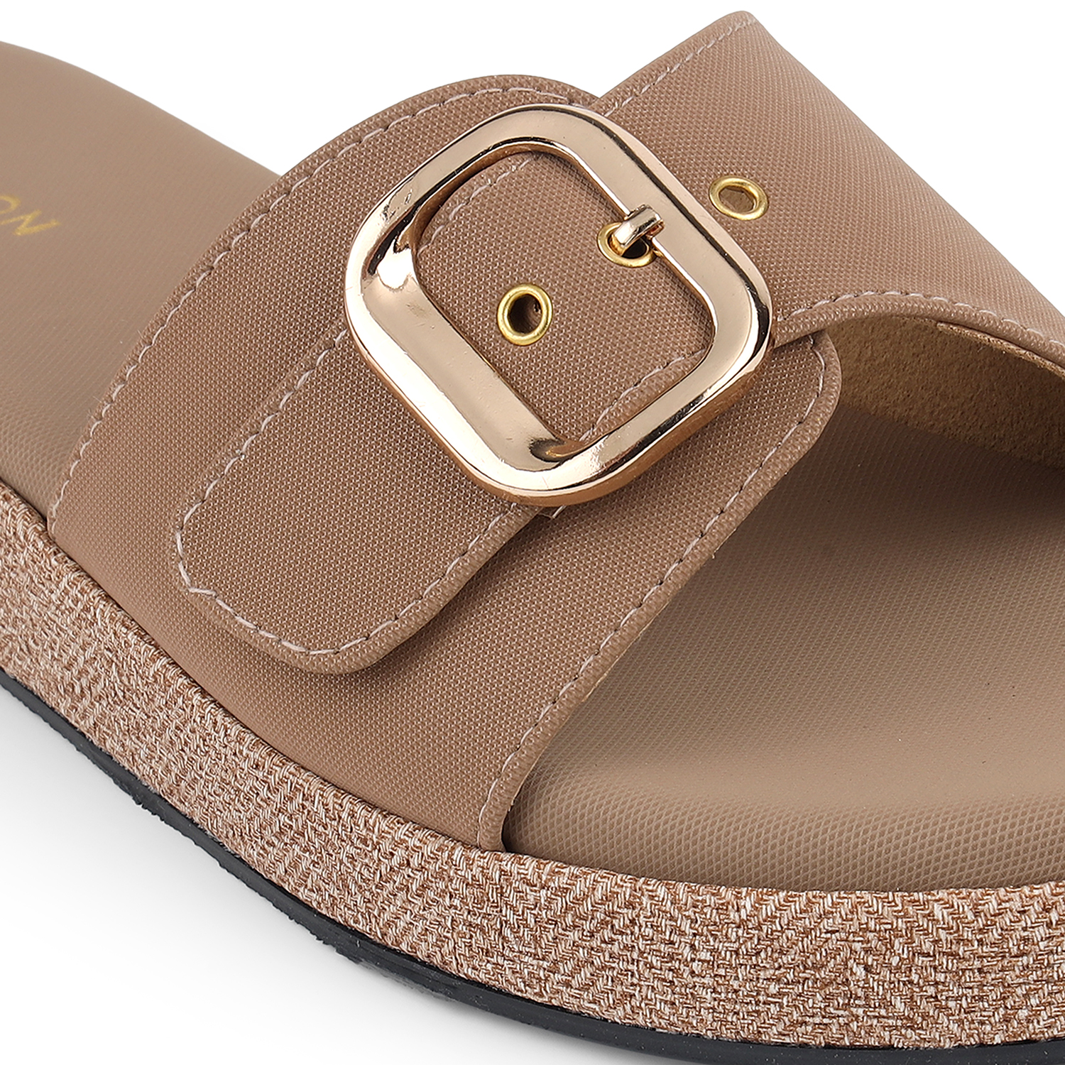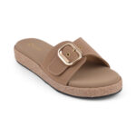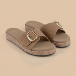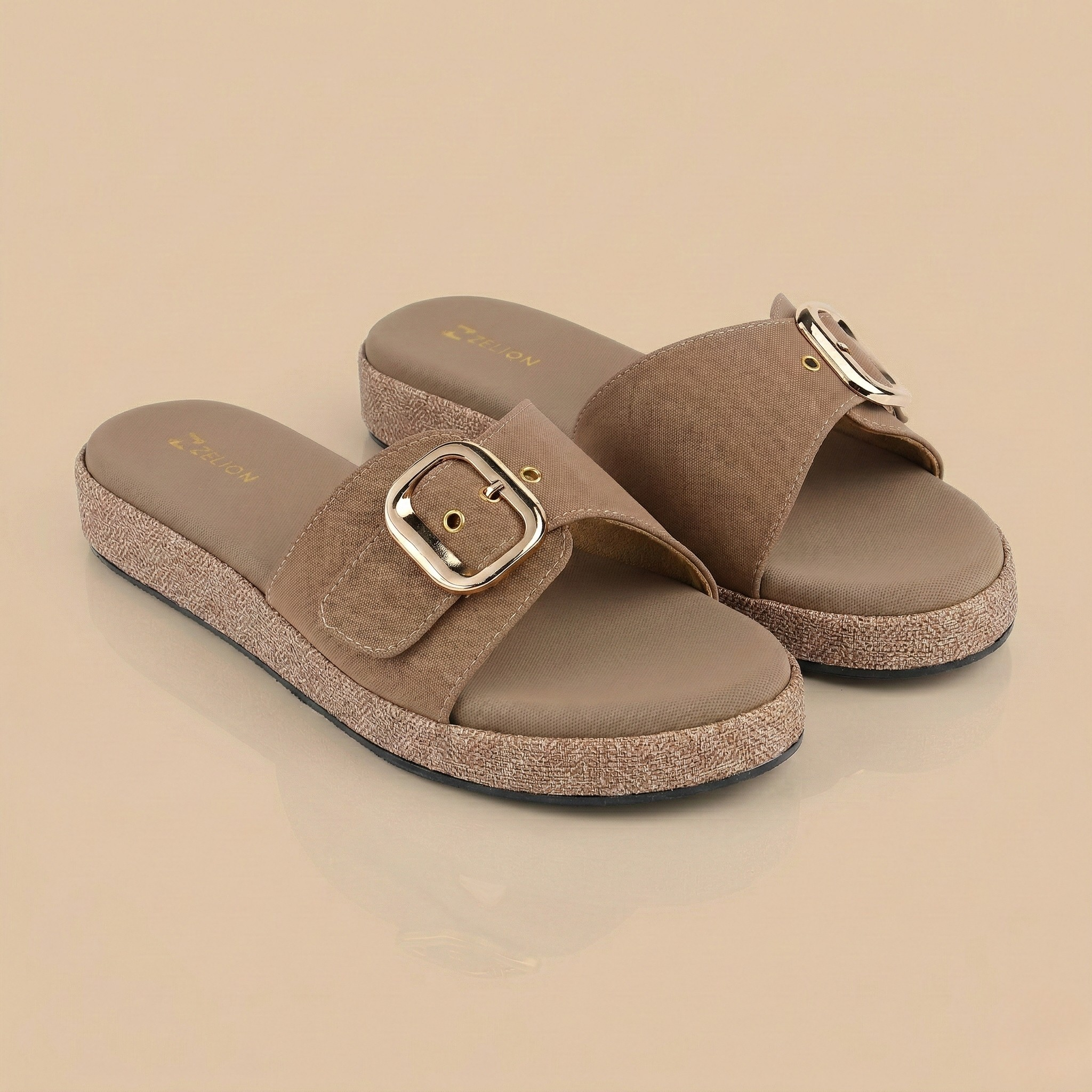 Step into effortless sophistication with the Zelion “Luna” Slide. A masterclass in “Comfort Crafted Design,” these slides blend a relaxed silhouette with high-impact metallic detailing. The soft beige upper is anchored by a bold, oversized gold-tone buckle, while the textured, woven-look platform adds a contemporary edge to a classic summer essential. Whether you’re poolside or strolling through the city, these slides provide the perfect lift and a secure, comfortable fit.
