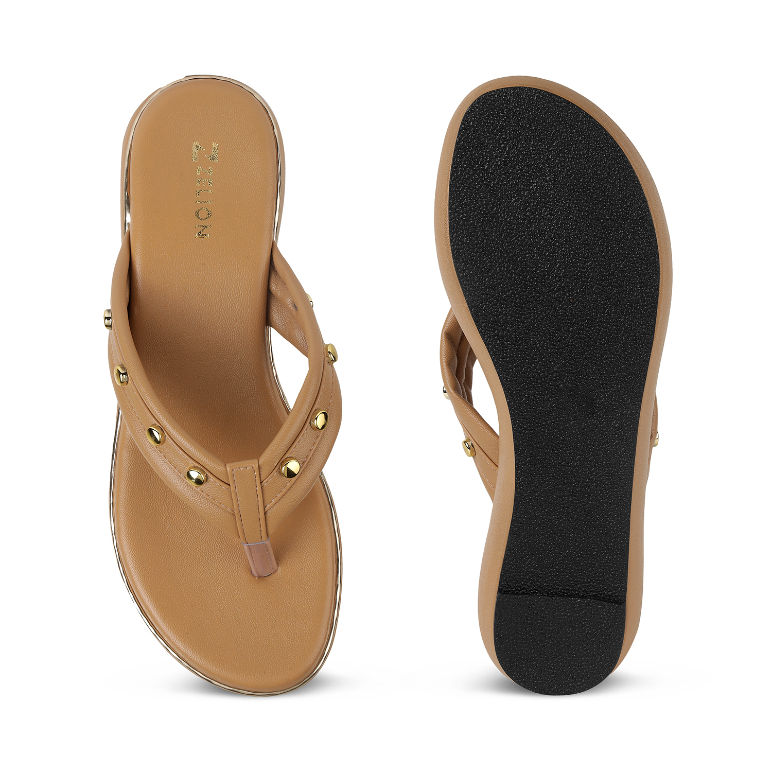 Elevate your daily ensemble with the ZELION Studded Platform Wedges. These sandals take the classic thong silhouette and transform it into a sophisticated fashion statement. The soft, padded straps are adorned with polished gold-toned studs, while a subtle gold metallic trim runs along the sole to add a hint of luxury to the deep black finish.