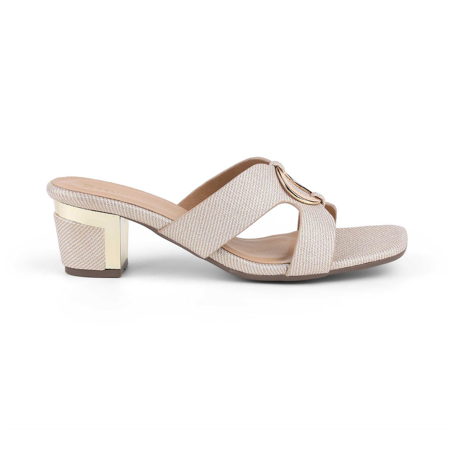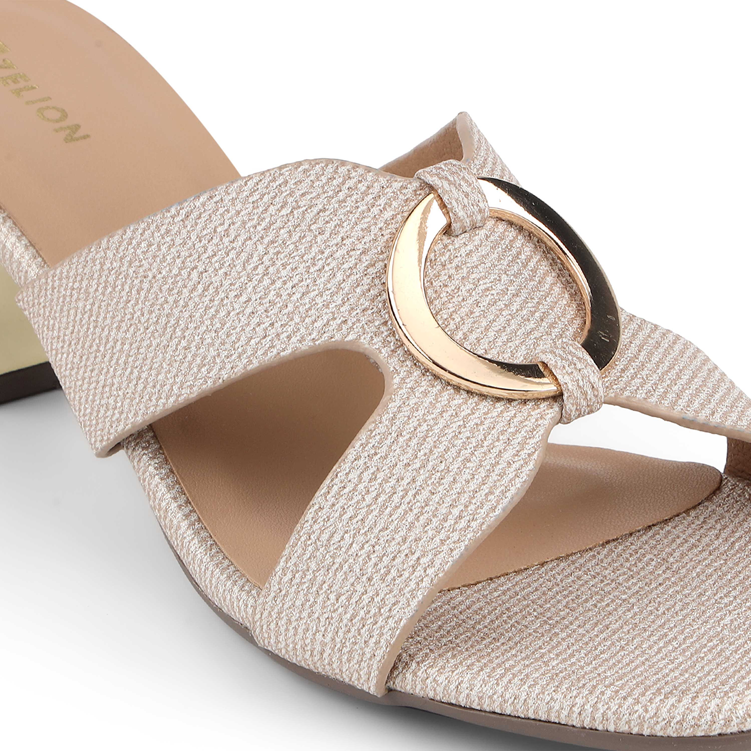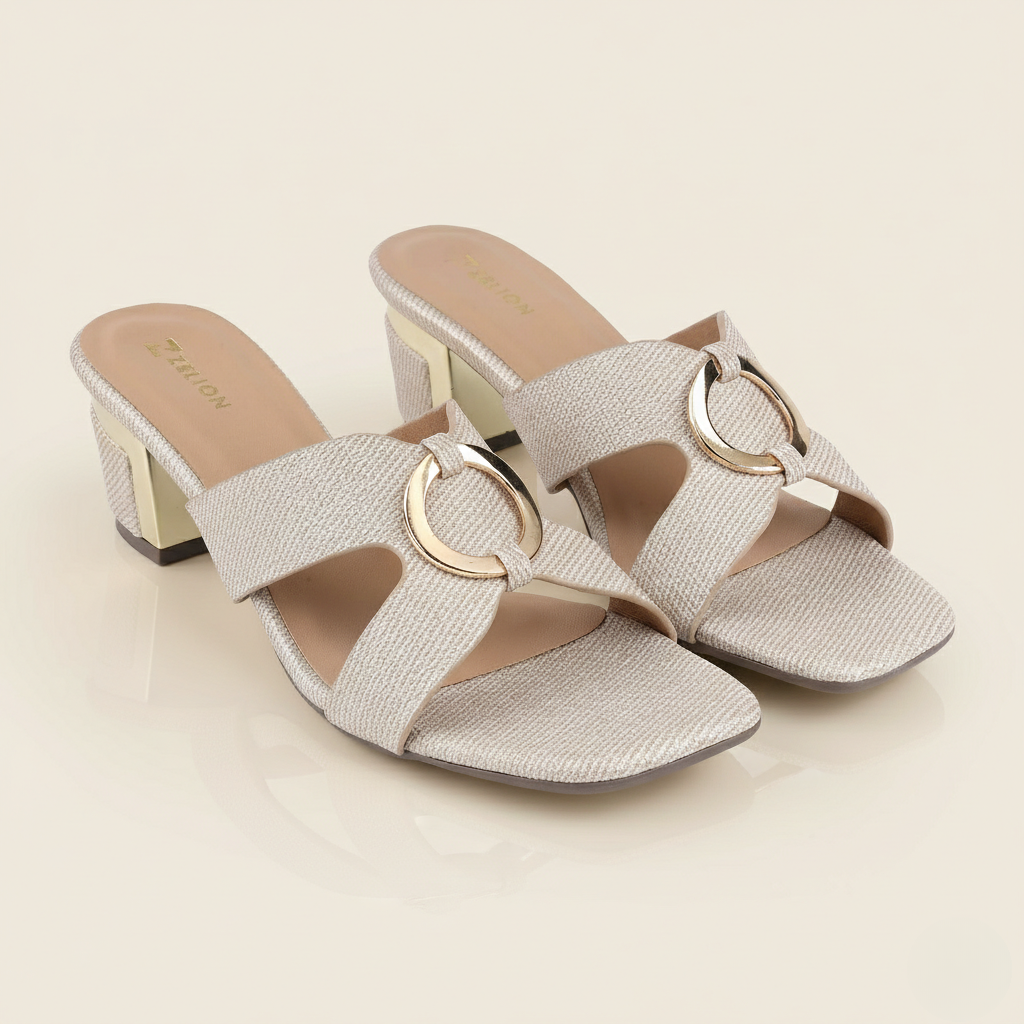 These Zelion slip-on block heel sandals deliver a premium look without trying too hard. The cross-strap upper, the bold gold ring detail, and the metallic finish block heel instantly make the footwear look luxurious.