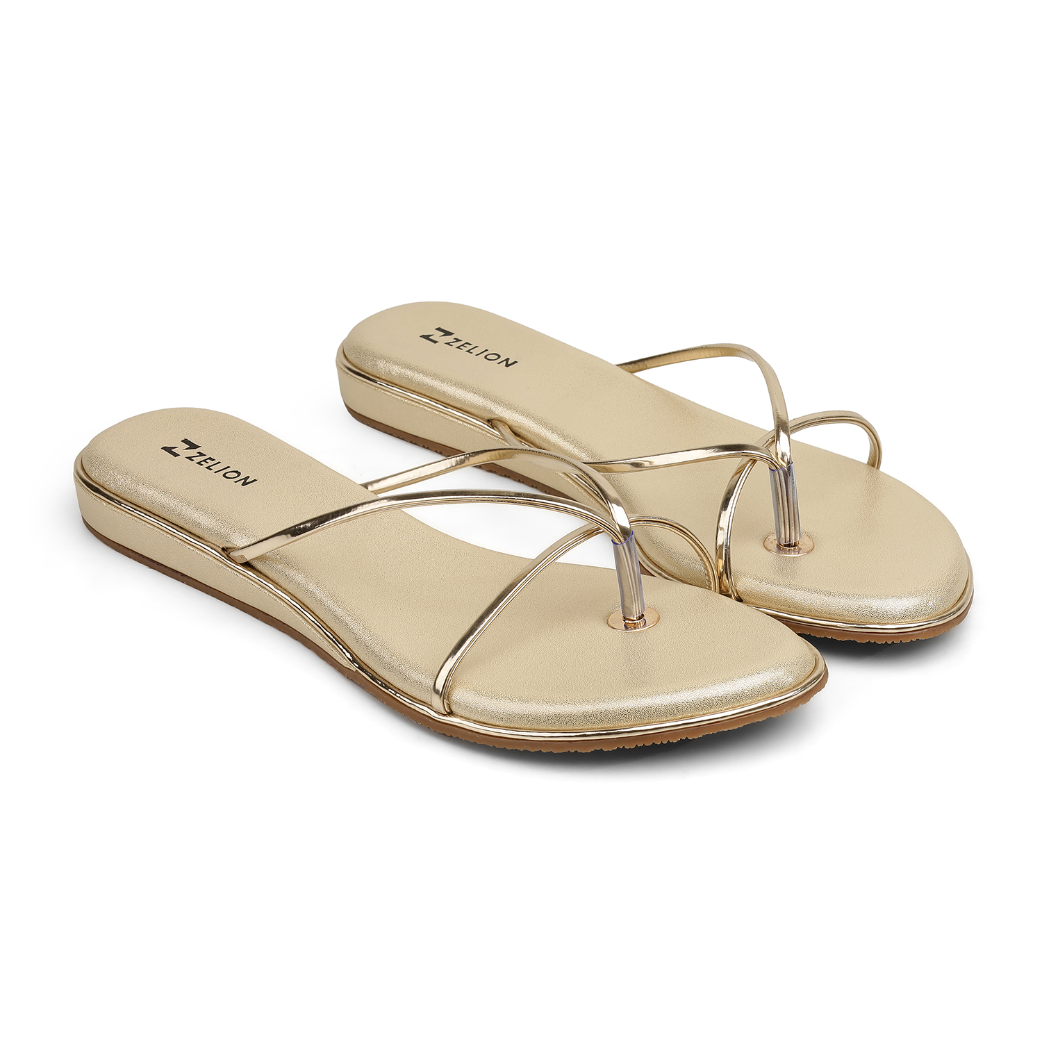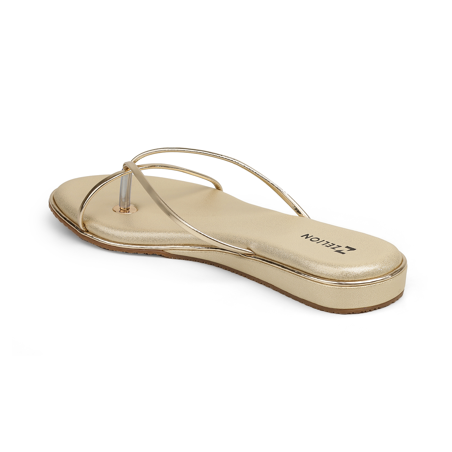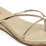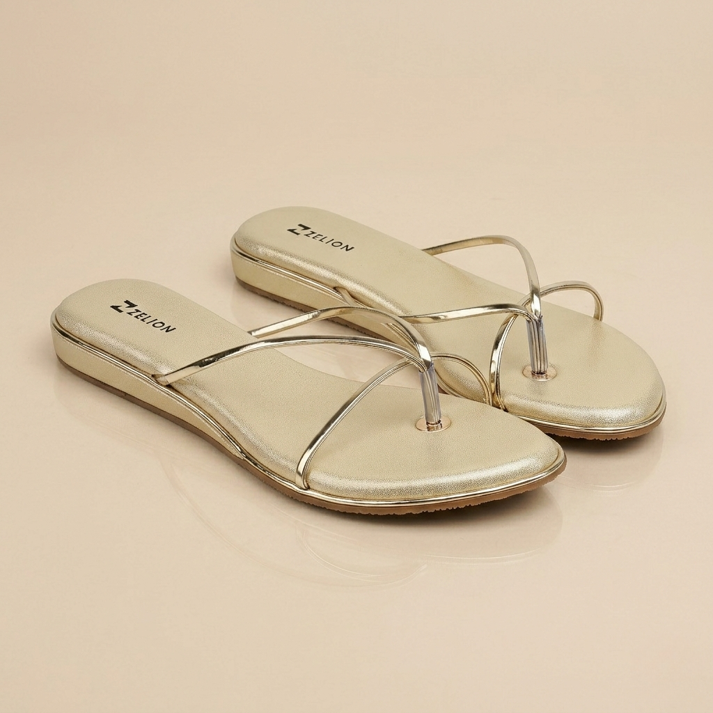 The Zelion Flat Sandal is a masterclass in understated luxury. Available in sophisticated Pewter and Gold, these sandals feature a unique triangular metallic plate with a micro-textured finish. The sleek T-strap design is elevated by a slim gold-toned piping that frames the footbed, perfectly capturing the brand’s “Comfort Crafted Design” philosophy.
